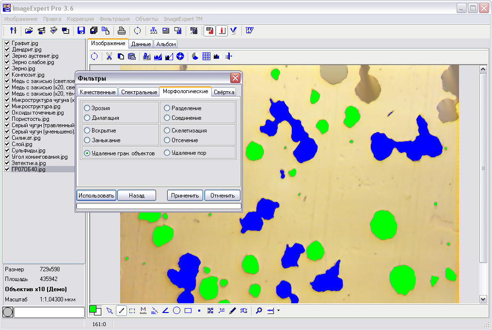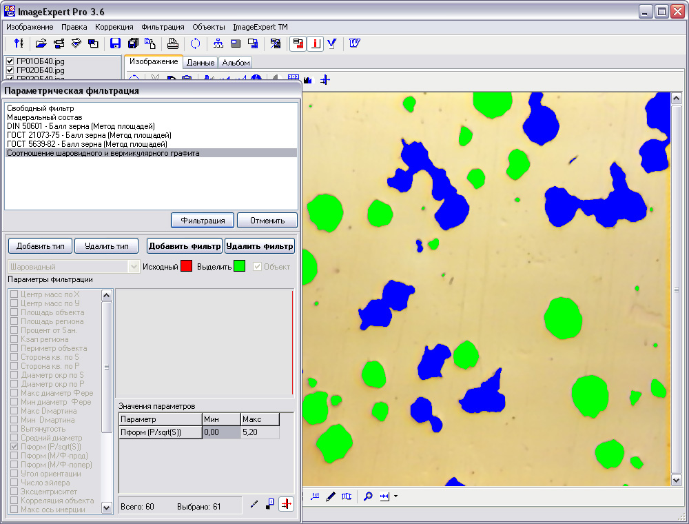 параметров, например выделение только сферических частиц с размером не менее 2 мкм, или отсеять частицы,